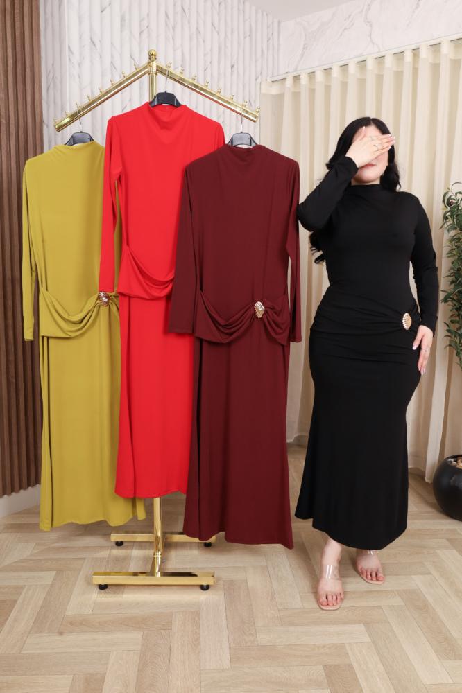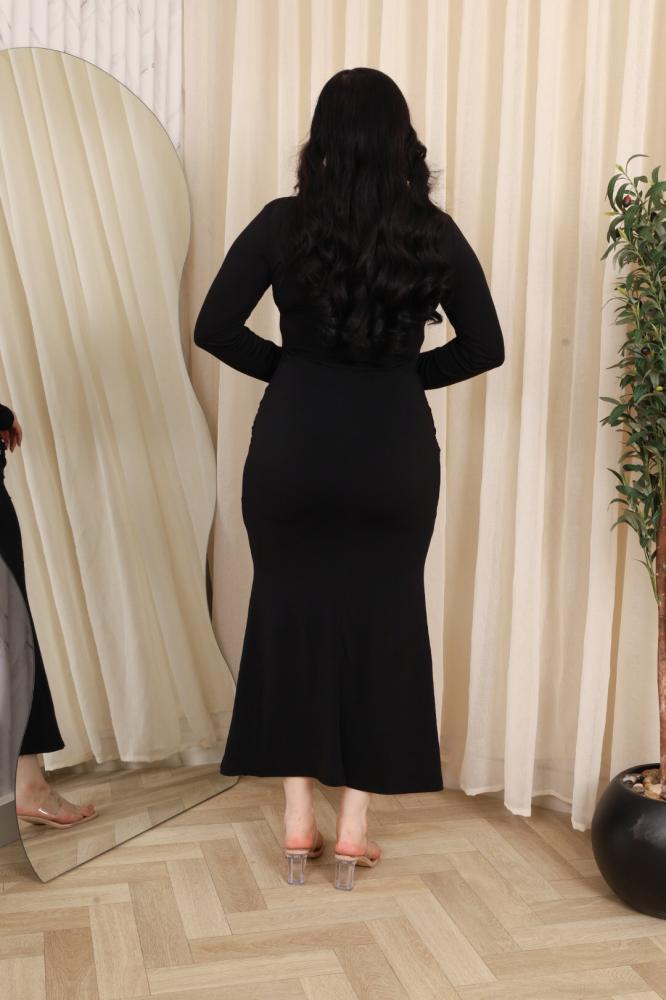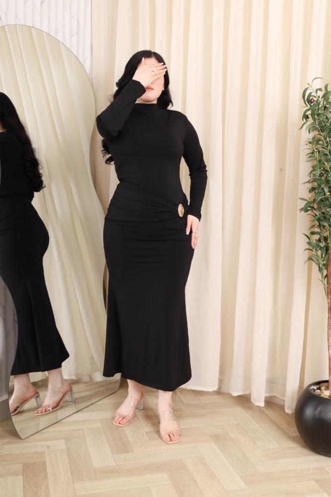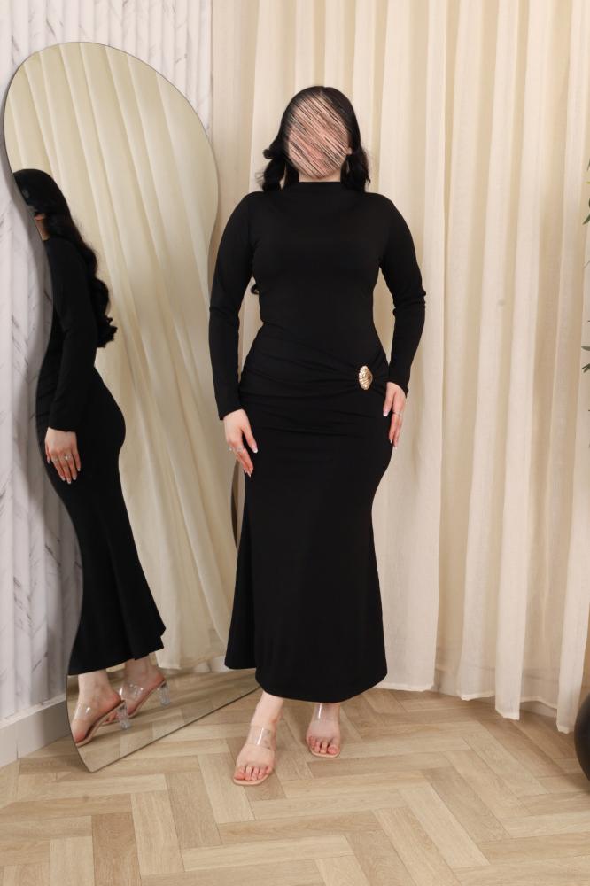 إطلالة راقية وناعمة بفستان أسود طويل من فيونا فاشن بتصميم محتشم وأنثوي يتميز بقصة ضيّقة تُبرز القوام، مع حركة لف خفيفة على الخصر مزينة ببروش ذهبي فاخر يضيف فخامة للتصميم.