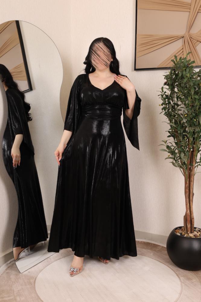 فستان أسود بلمعة ناعمة تعكس الأنوثة والرقي من فيونا فاشن بتصميم ينسدل بانسيابية على الجسم ويبرز جمال القوام يتميز بأكمام واسعة تضيف لمسة فريدة، مع خصر محدد يعزز الإطلالة الأنثوية الخامة ميتاليك وتناسب الحركة بكل أريحية مثالي للسهرات أو المناسبات البسيطة.