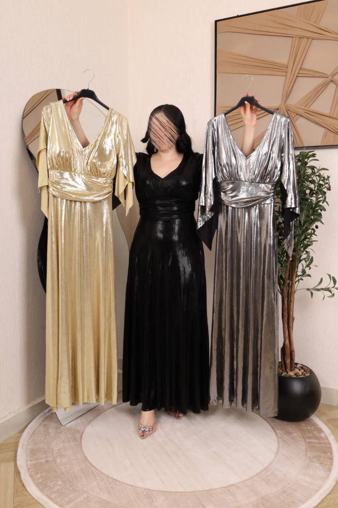 الاسم: فستان أسود ميتاليك لامع بحزام أنيق