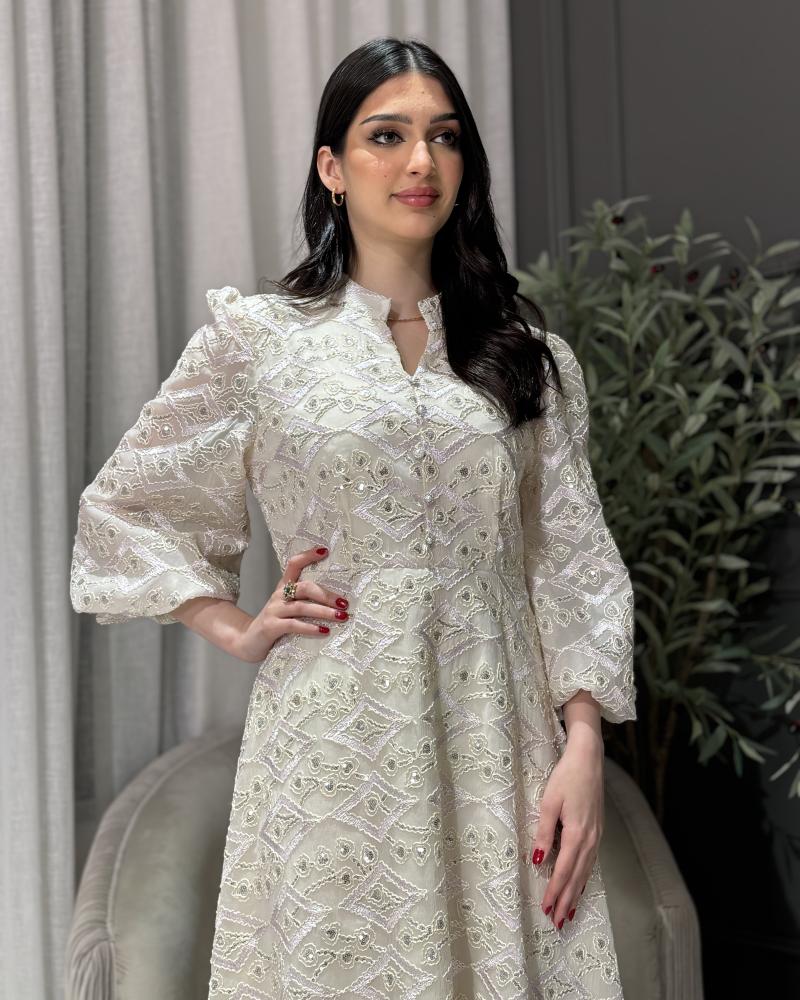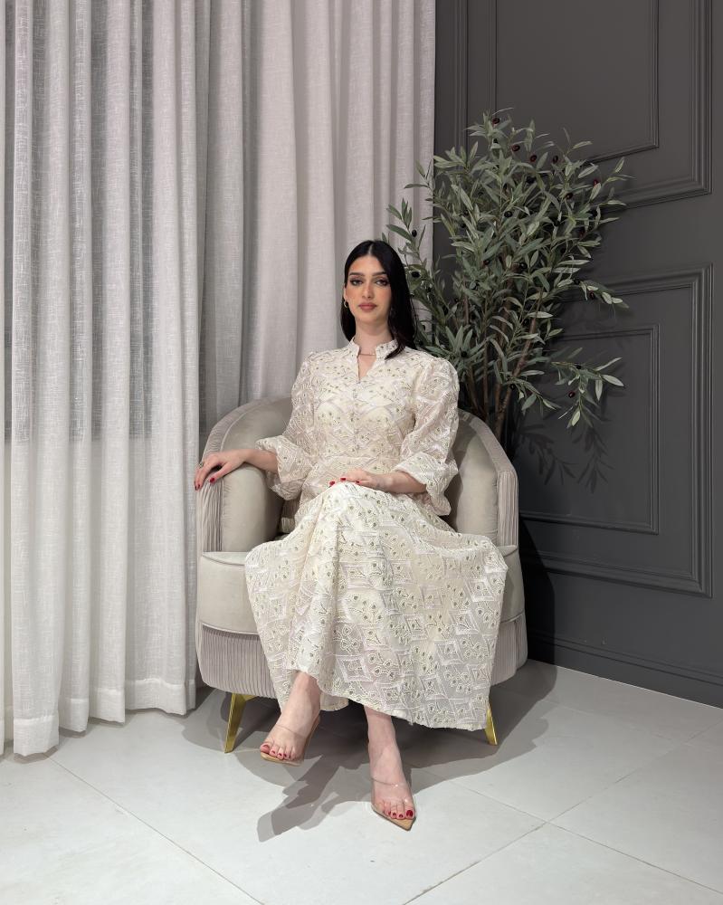 لإطلالة ناعمة تخطف الأنظار، لكِ من فيونا فاشن فستان ميدي أوف وايت بتصميم أنثوي ساحر، مصنوع من الدانتيل الفاخر بلمسة راقية، ومثالي لكل مناسبة فيها تكونين الأجمل!✨