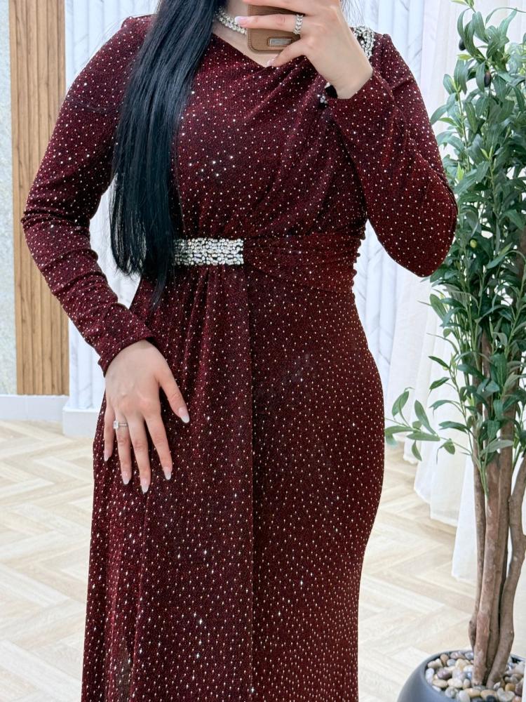 فستان عنابي طويل من فيونا فاشن بقماش مطرز ناعم، مزين بفصوص دقيقة لامعة تعكس الإضاءة