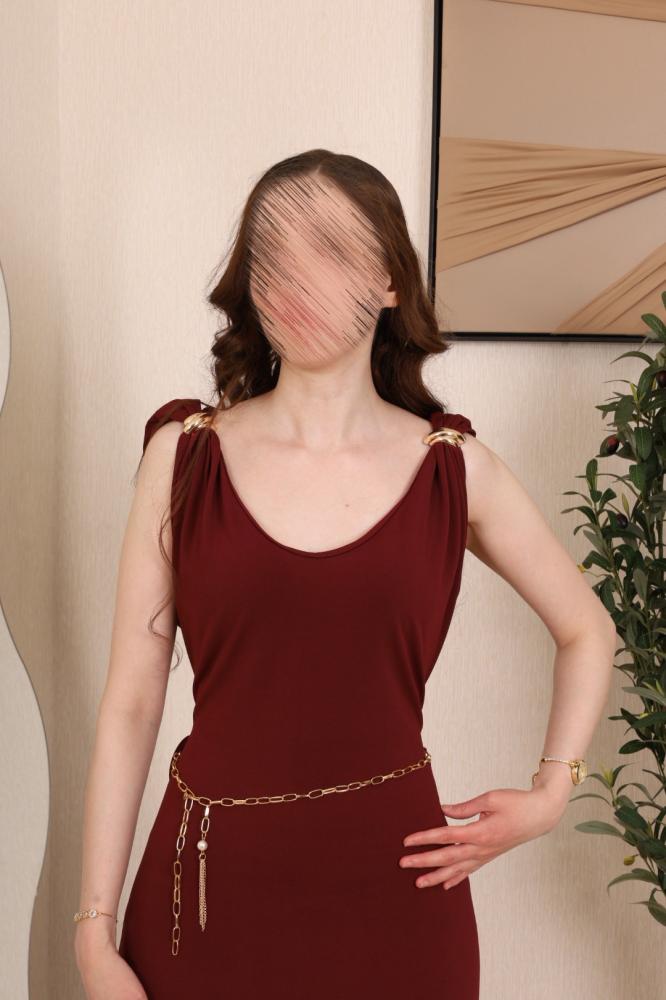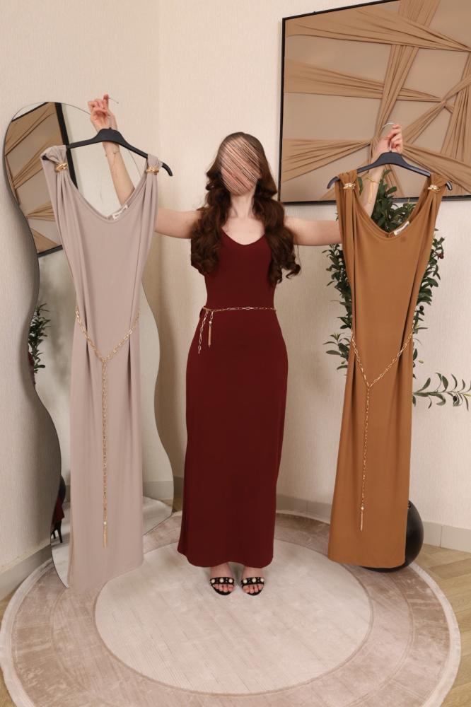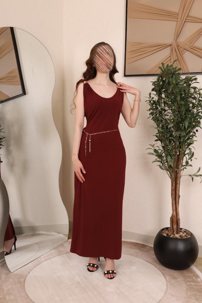 الاسم: فستان عودي طويل مزين بحزام ناعم