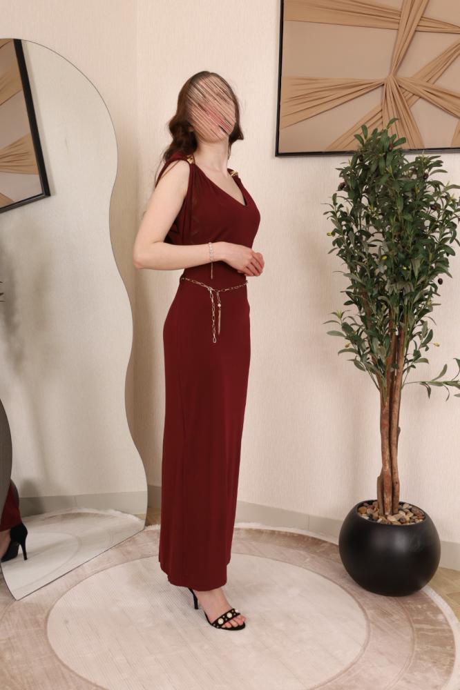 فستان عودي طويل مزين بحزام ناعم
