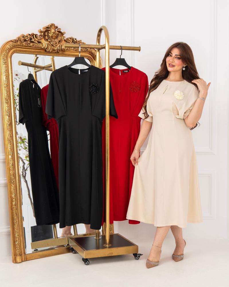 يُزين الكتف وردة قماش فاخرة تضيف لمسة راقية، بينما تأتي الأكمام بقصة منفوشة ناعمة تمنحك حرية الحركة ومظهرًا أنثويًا جذابًا