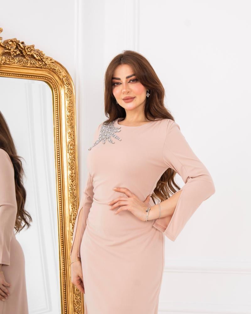 تألقي بإطلالة ناعمة من فيونـــا فاشن مع هذا الفستان الراقي . يتميز بقصة ضيقة ناعمة تبرز جمال القوام، مع تفاصيل فصوص فضية مطرزة على الكتف تضيف لمعان متألق